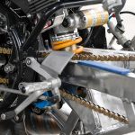 Swingarm belakang dipinjam daripada TZR250( 3MA) dan padankan dengan monoshock Aprilia RSV1000. Rim belakang menggunakan komponen Harley-Davidson Fat Bob saiz 8.00-18.