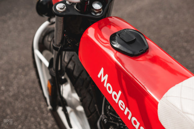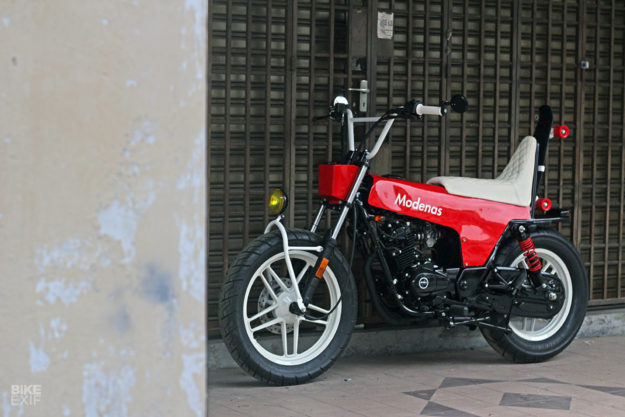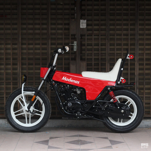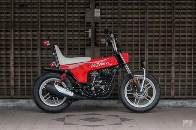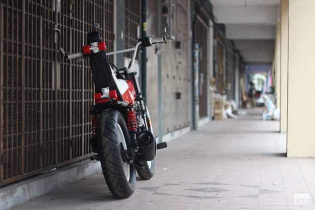 DALAM hal modifikasi automotif, imaginasi kreatif dan fikiran luar kotak memang sangat diperlukan supaya jentera yang dihasilkan dapat tampil berbeza. Siapa sangka imaginasi luar biasa Irwan Cheng daripada FNG Works ini mampu menukarkan streetbike ala cafe racer, Modenas V15 jadi sebuah fun bike unik dengan gabungan rekabentuk Honda Dax, BMX dan sedikit chopper.