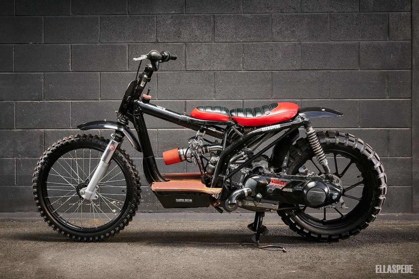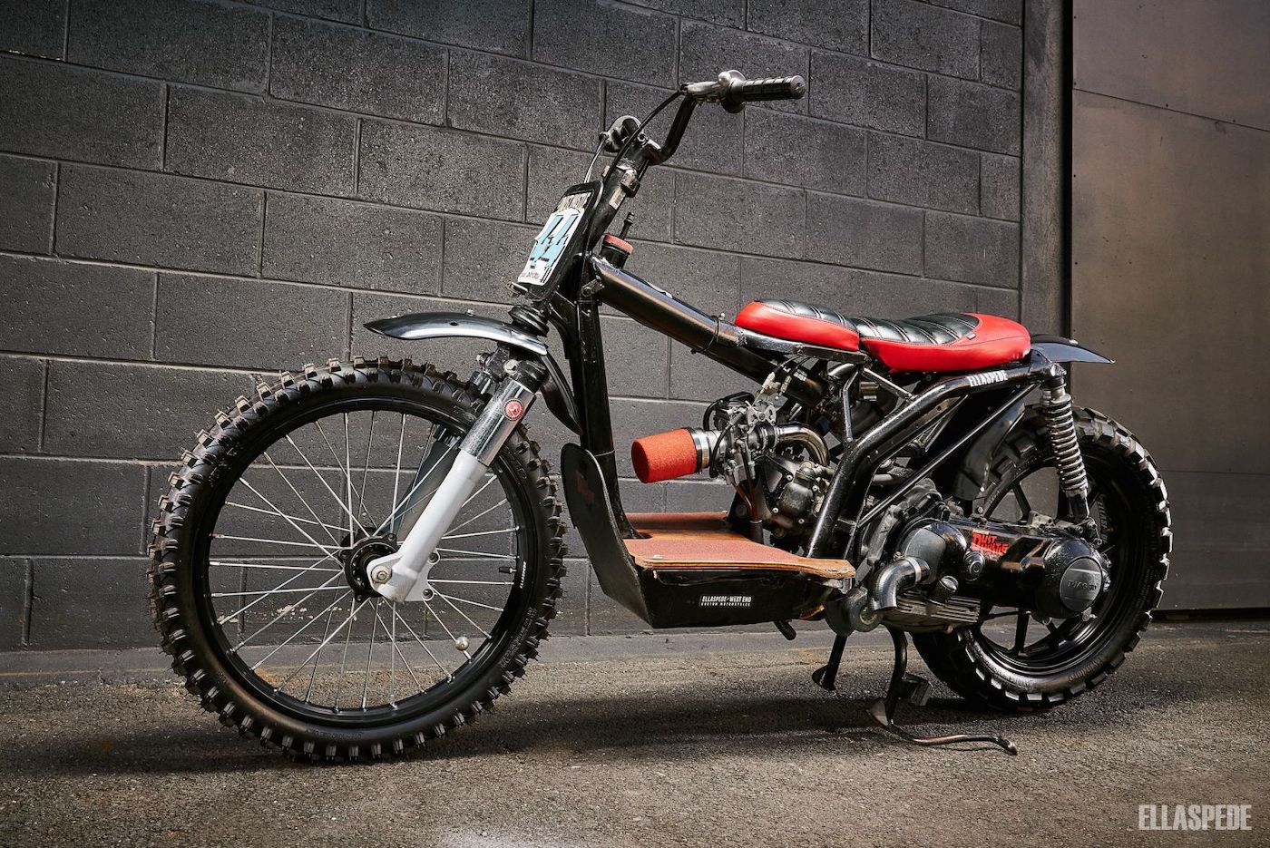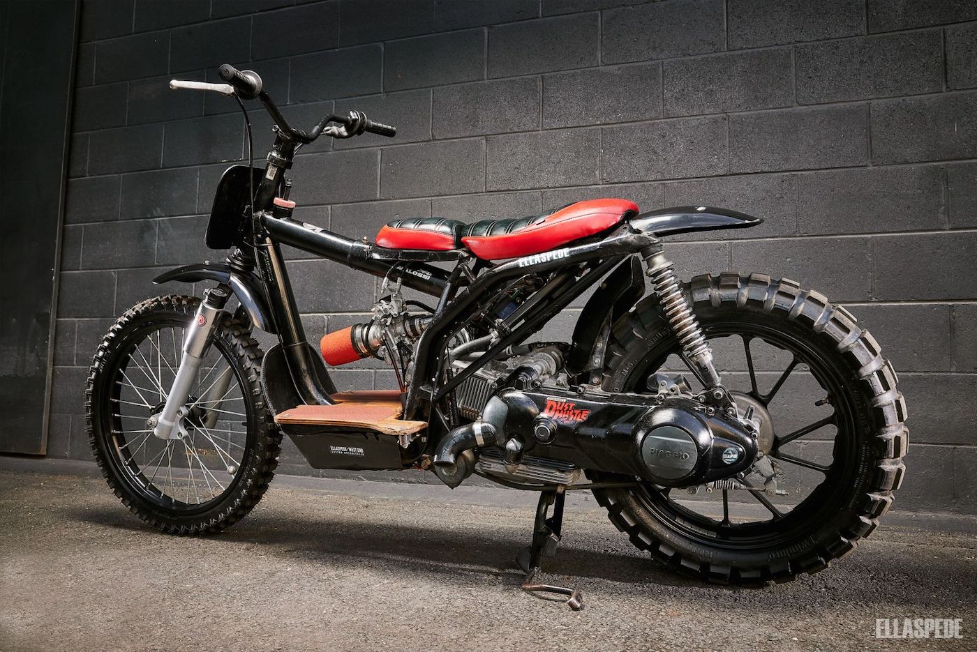 MUNGKIN ramai sukar percaya ini adalah sebuah skuter Piaggio Liberty 150 edisi 2003 yang berubah wajah menjadi model flat track. Individu yang membinanya ialah Steve Barry dari bengkel Ellaspede.