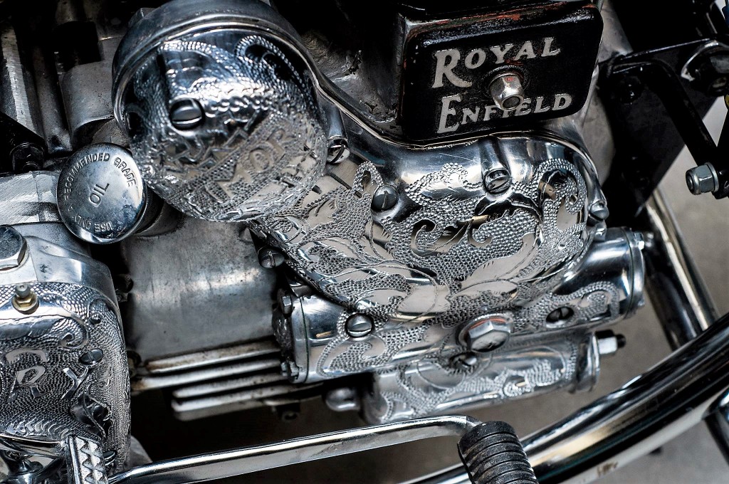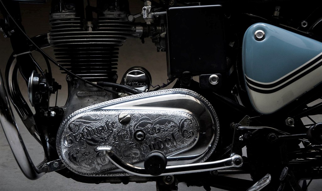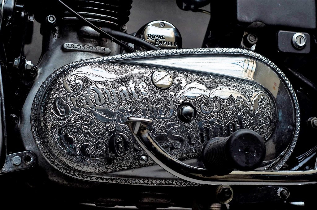 Jentera kustom ini turut menampilkan ukiran tangan pada penutup klac, penutup kotak gear, dan beberapa bahagian lain.ย Hasilnya, Royal Enfield Bullet โThe Graduateโย tampil retro dan moden yang seiring peredaran zaman.