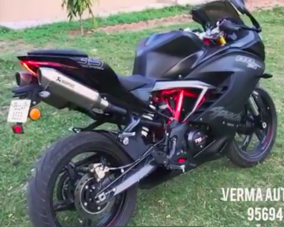 BENGKEL motosikal kustom di Chandigarh, India, Verma Automotives mengubah suai dua ekzos dan dipasangkan di bawah pelana TVS Apache RR 310. Mungkin pemilik Kawasaki Ninja 250 dan Yamaha R15 atau seangkatan dengan dua sportbike itu boleh cuba-cuba. Nampak macam lebih garang.