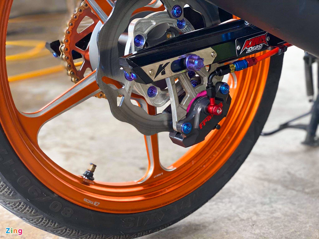 Set roda belakang disokong swingarm King Drag yang lebih kompak dan panjang daripada unit standard. Sistem brek pula menggunakan kaliper brek Frando dan cakera brek Galfer.