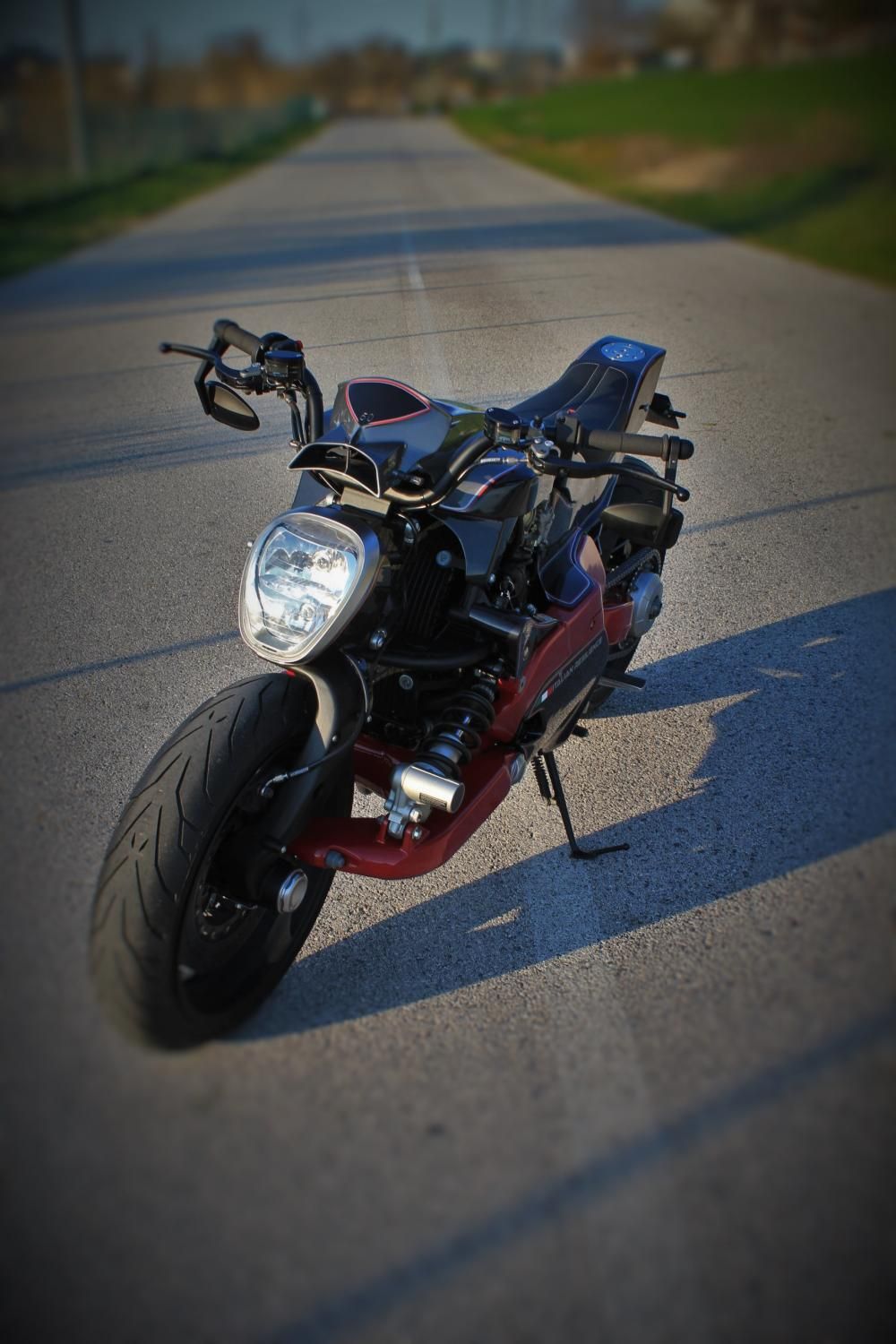 Tangki minyak ditanggalkan dan digantikan dengan komponen fairing untuk memuatkan unit karburetor baharu. Kaca pleksi (plexiglass) yang transparen, kuat dan fleksibel ditambah untuk sengaja mendedahkan visual dua karburetor, manakala tangki minyak baharu diposisikan pada panel belakang.