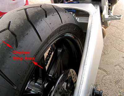 Caranya, perhatikan lebar kawasan jejak atau bekas geseran jalan yang berbaki pada tayar motosikal anda (foto atas kiri), juga digelar ‘chicken strips’, iaitu istilah khas yang ditujukan kepada penunggang yang kurang berani (chicken = ayam) melayan ‘corner baring’. Di bawah ialah contoh chicken strips yang berpunca daripada kombinasi tayar lebar dan skil tunggangan kurang mantap.