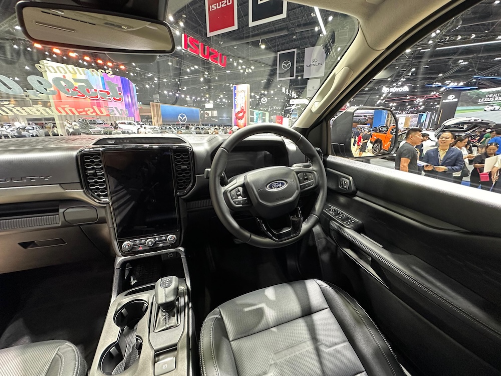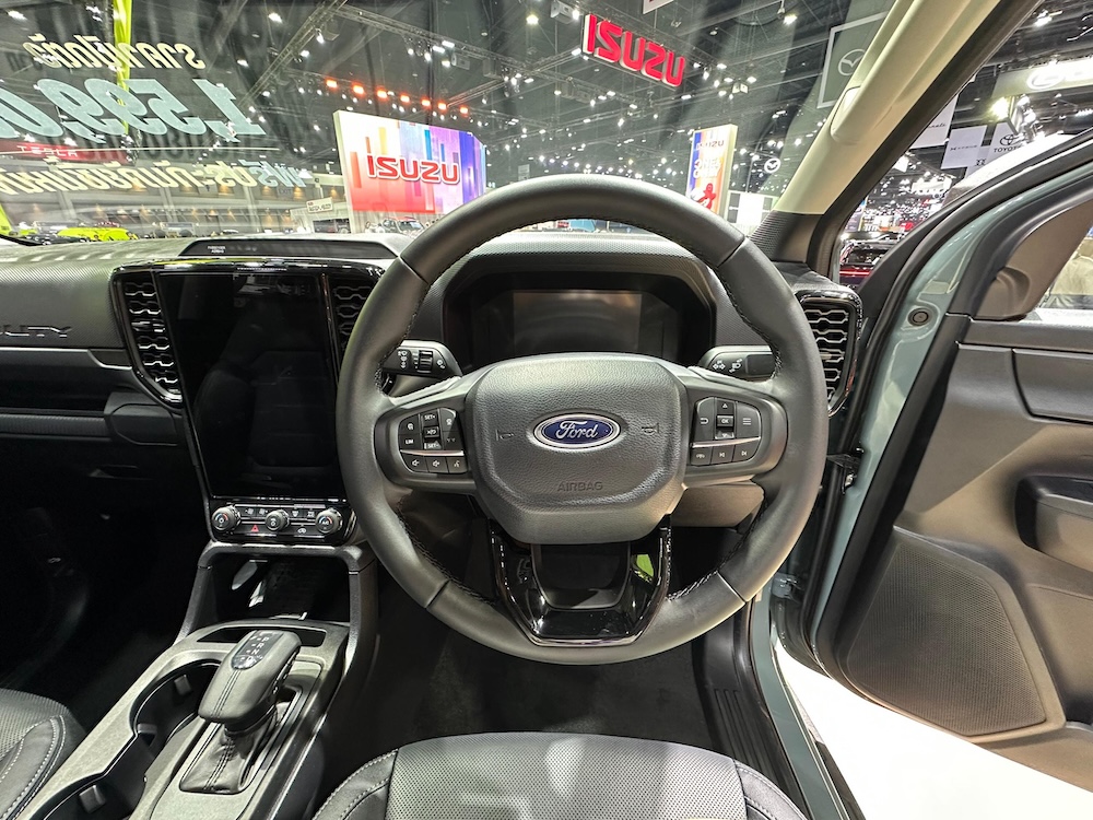 Ruang dalaman masih mengekalkan DNA Ranger moden dengan unit infotainmen vertikal 12 inci, tetapi Ford menambah barisan suis auksiliari atas cermin pandang belakang untuk memudahkan pemasangan aksesori tambahan seperti lampu spot atau winch.