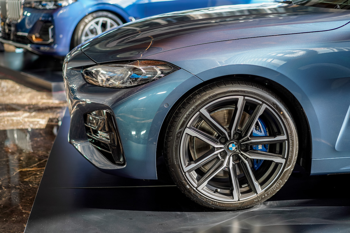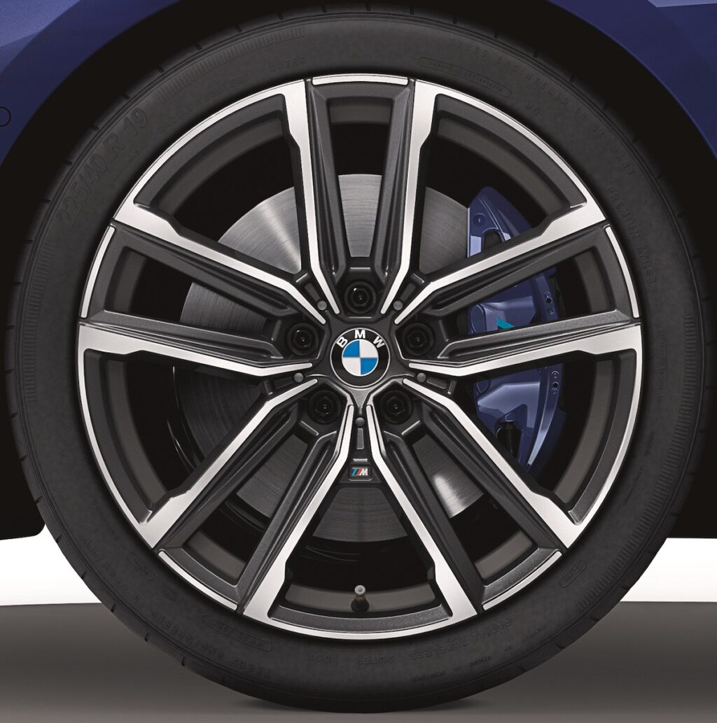 - Dipasangkan rim aloi ringan M saiz 19 inci dengan jejari dwi-tona yang dibalut tayar campuran jenis run-flat, dan diapit kaliper brek M Sport biru.