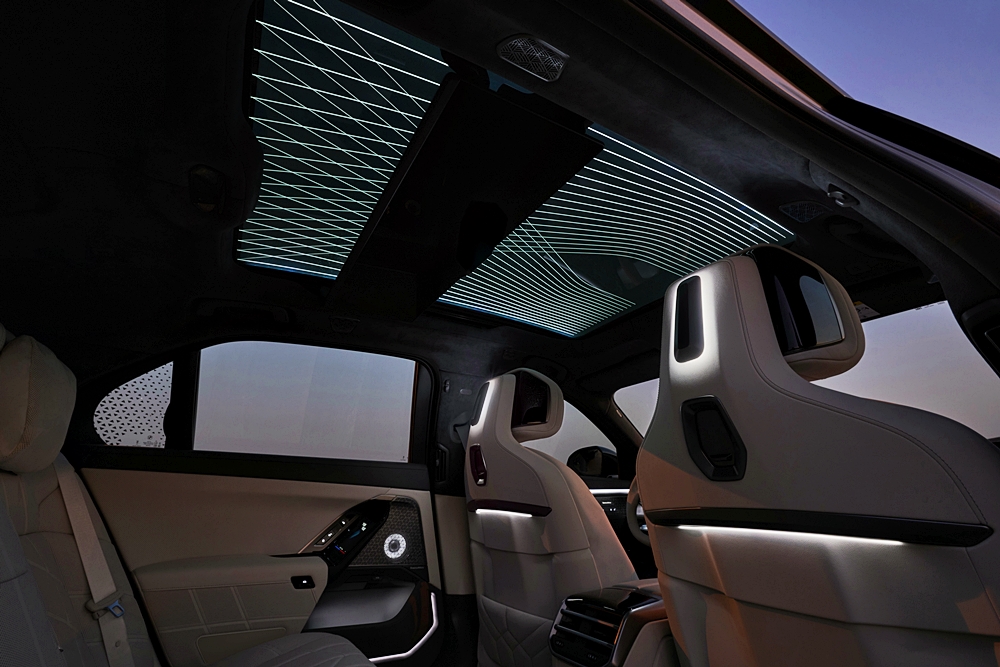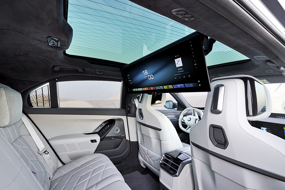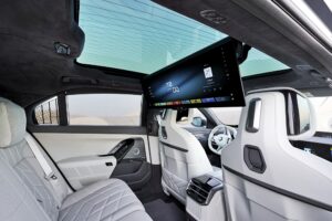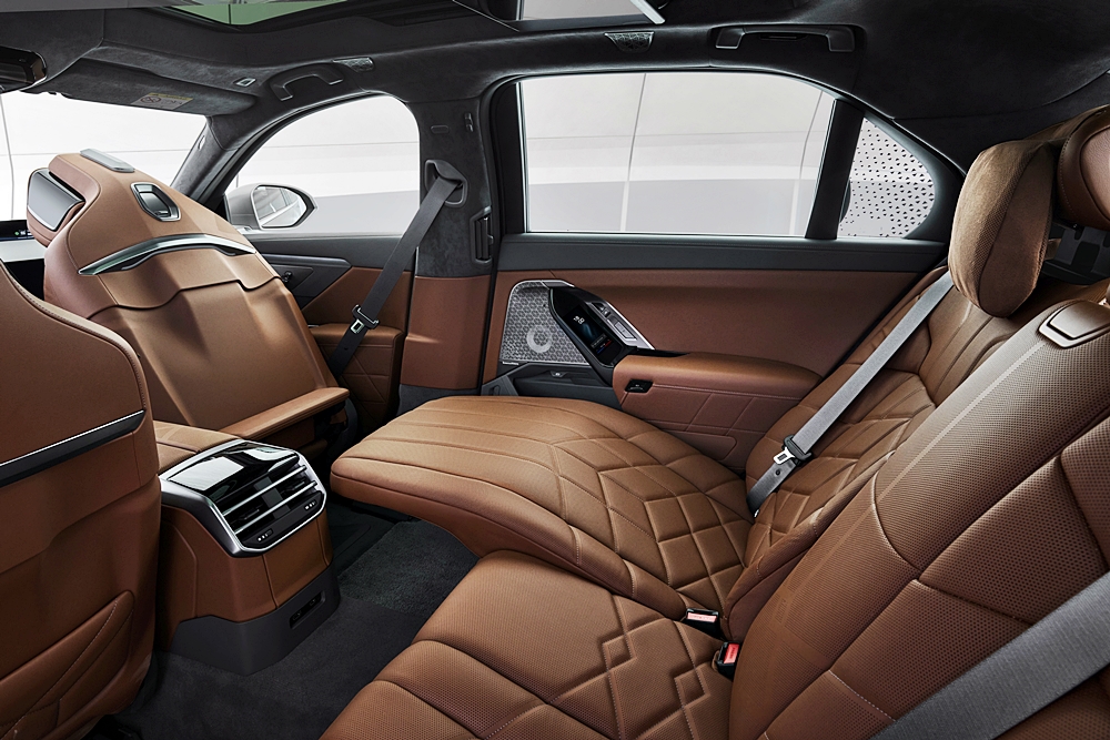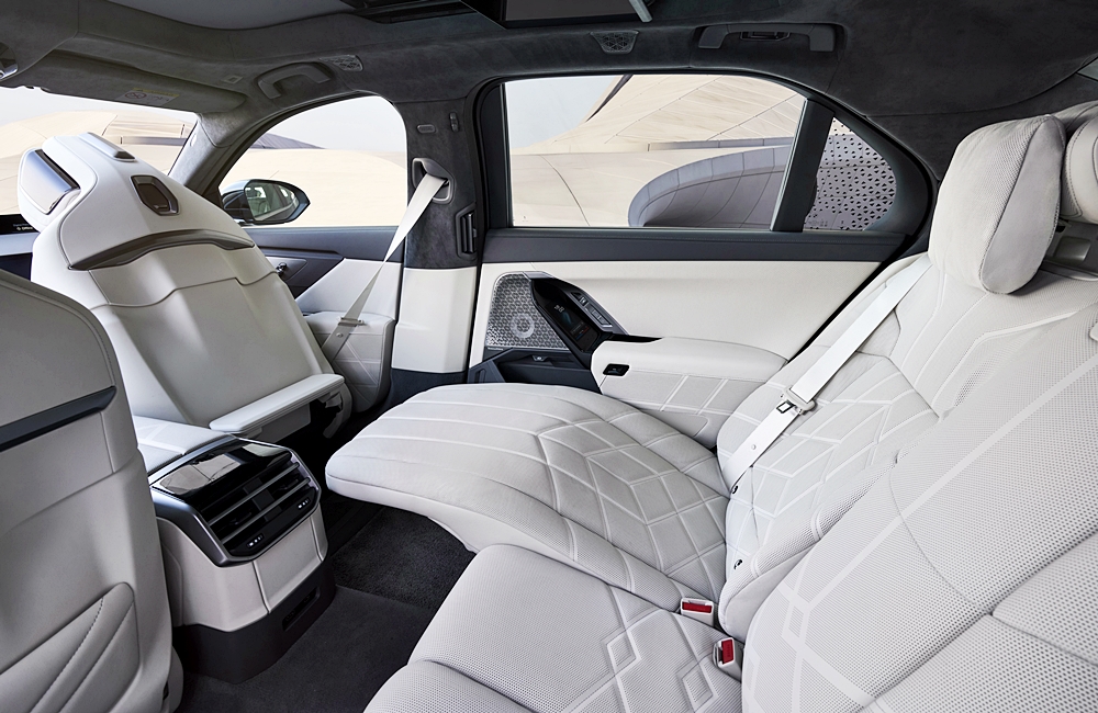 Untuk penumpang belakang, terdapat BMW Theatre Screen yang dipertingkatkan untuk pengalaman sinematik 8K, permainan video, atau panggilan video melalui aplikasi pihak ketiga. Sistem hiburan turut disokong oleh sistem bunyi Bowers & Wilkins dengan Dolby Atmos.