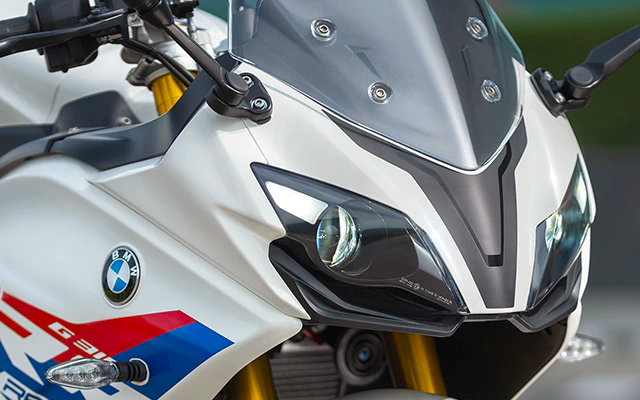 - Lampu utama LED terpisah dengan bentuk badan tajam. Perbezaan dengan model TVS ialah skema warna yang mana BMW menawarkan kombinasi putih, merah dan biru.