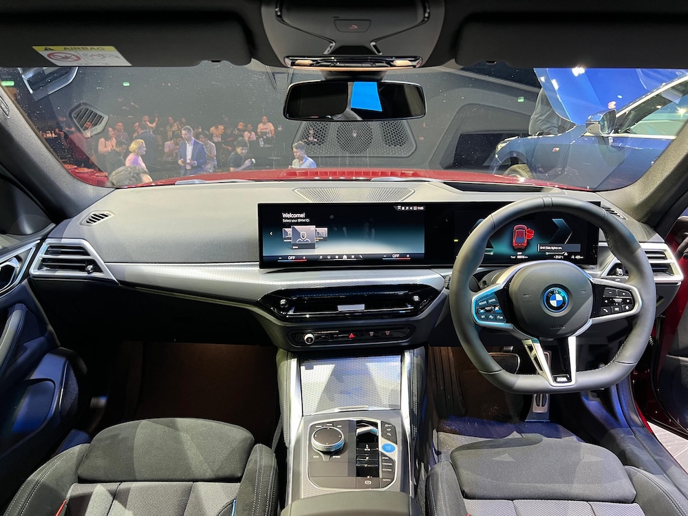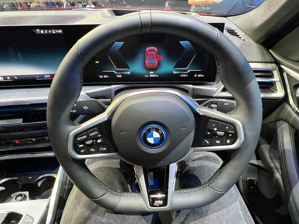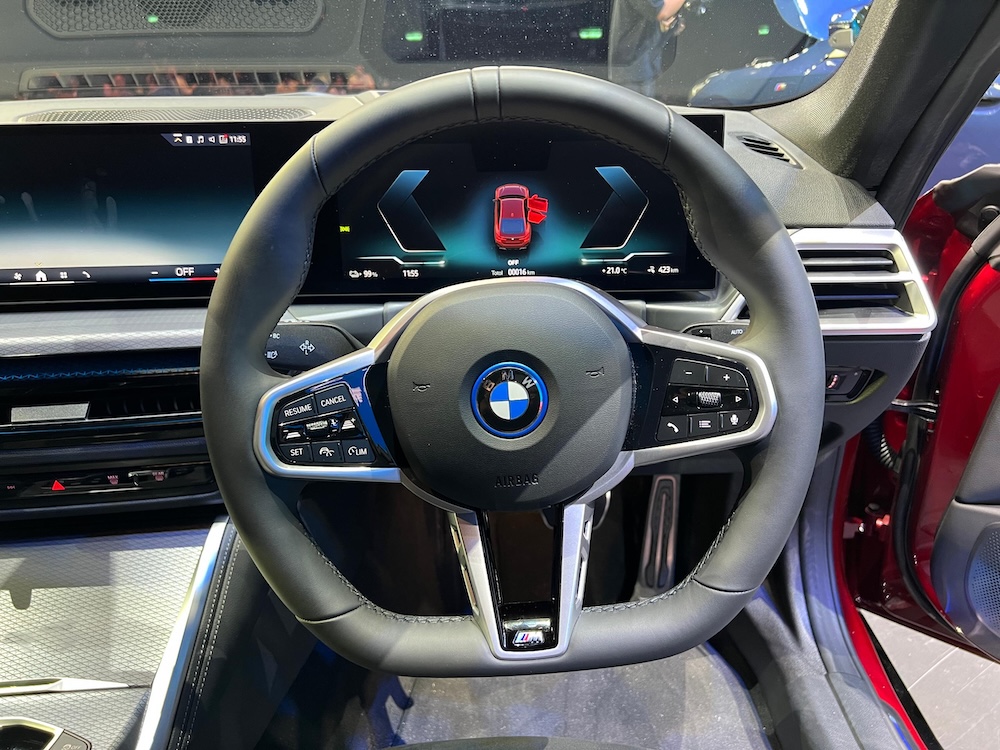 - Kabin BMW i4 eDrive35 M Sport dipenuhi teknologi moden dan kemewahan menerusi stereng sport dengan rekaan tiga jejari dan indikator jam 12 untuk fungsi dan estetika tambahan.