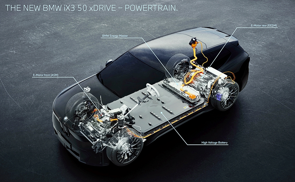 - BMW iX3 hadir dengan sistem pacuan elektrik generasi keenam dalam dua konfigurasi, motor tunggal pacuan roda belakang atau sistem dwi-motor pacuan semua roda xDrive.