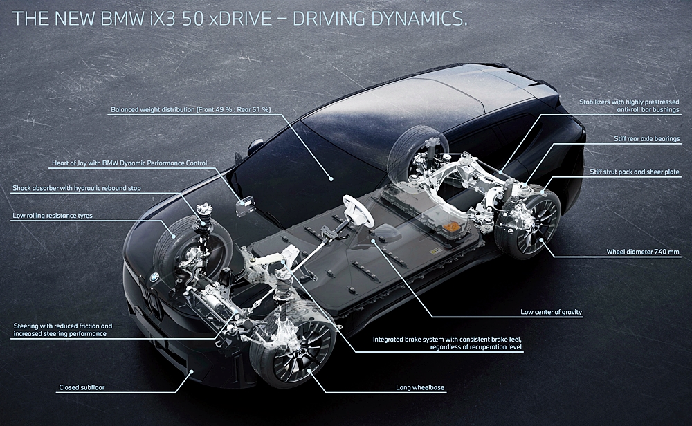 - BMW iX3 menggunakan sistem gandar hadapan dan belakang yang direka baharu untuk keseimbangan antara keselesaan dan kawalan.