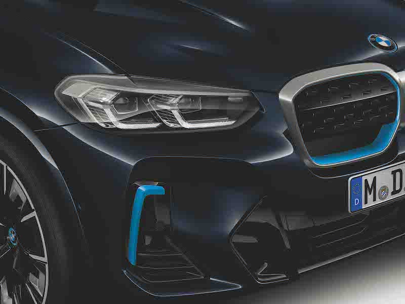 - BMW iX3 Impressive hadir dengan warna M Carbon Black Metallic, kemasan kulit Vernasca hitam dan jahitan benang biru dan hitam.