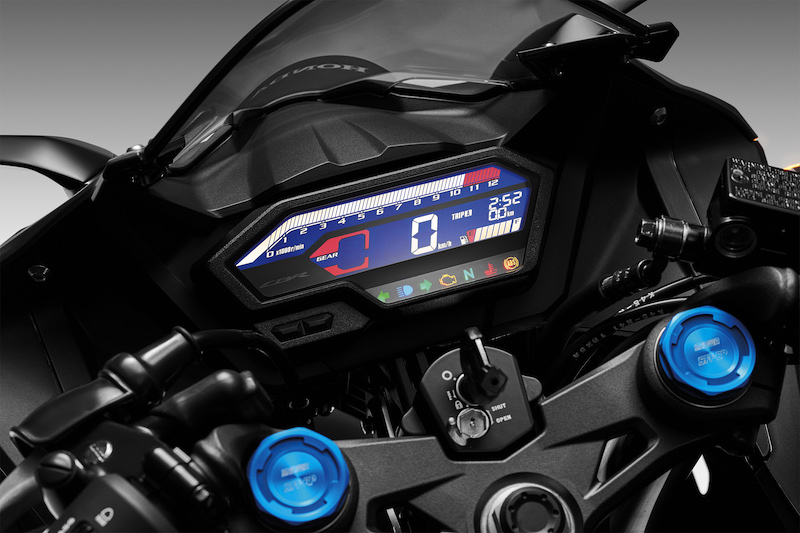 - Panel meter berbentuk bar memanjang jenis digital penuh memaparkan maklumat tunggangan spidometer, takometer, indikator gear, paras baki minyak petrol, jam, jarak tunggangan serta set lampu amaran pada bawah skrin meter.