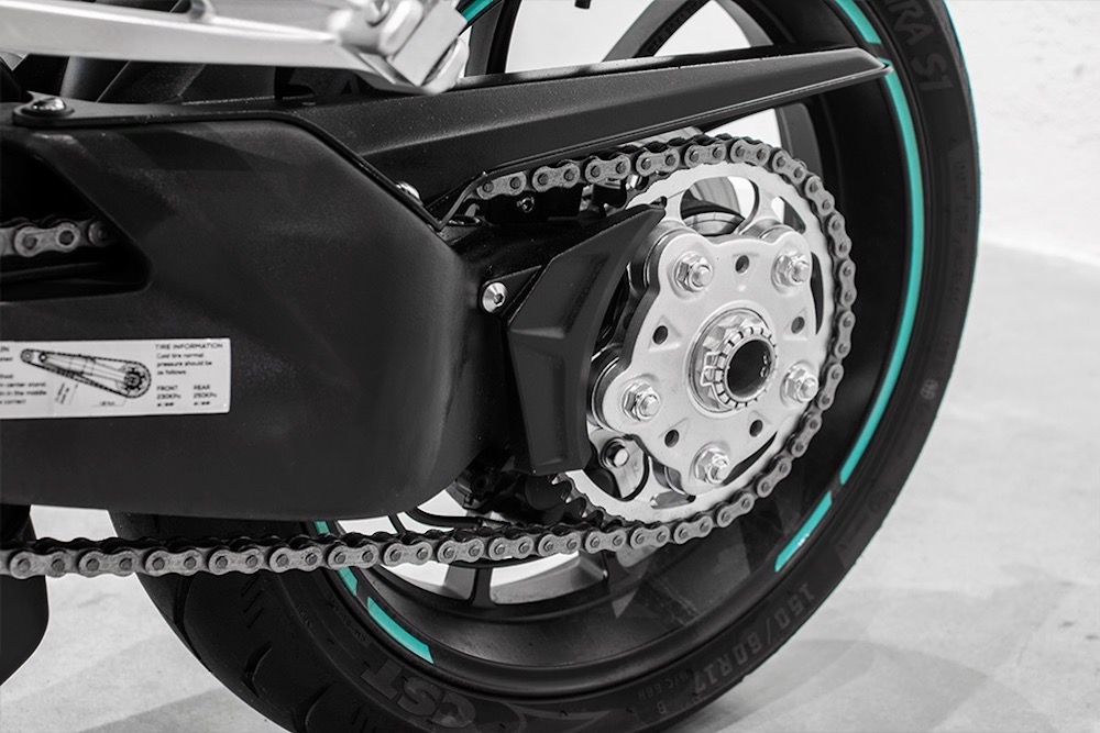 - Sistem fork terbalik (USD) dengan penyerap hentak tunggal di belakang. Swingarm jenis sebelah.