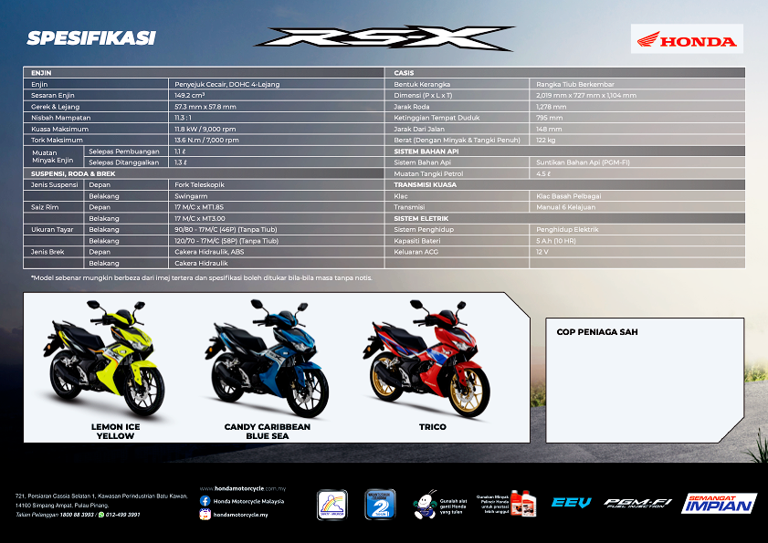 Harga tidak termasuk cukai jalan, insurans, dan pendaftaran. Setiap pembelian dipakejkan dengan waranti kilang dua tahun atau 20,000km (mana satu tiba dulu). Maklumat lanjut boleh kunjungi pengedar BSH terdekat atau hubungi talian bebas tol 1-800-88-3993 atau layari www.boonsiewhonda.com.my.