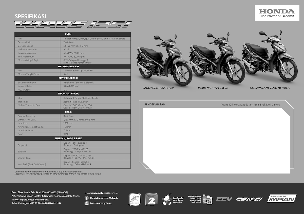 - Harga asas RM6,449 tidak termasuk cukai jalan, insurans, pendaftaran dan nombor plat. Setiap pembelian dipakejkan bersama waranti kilang dua tahun atau 20,000km (mana satu tiba dulu).