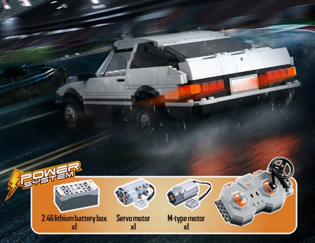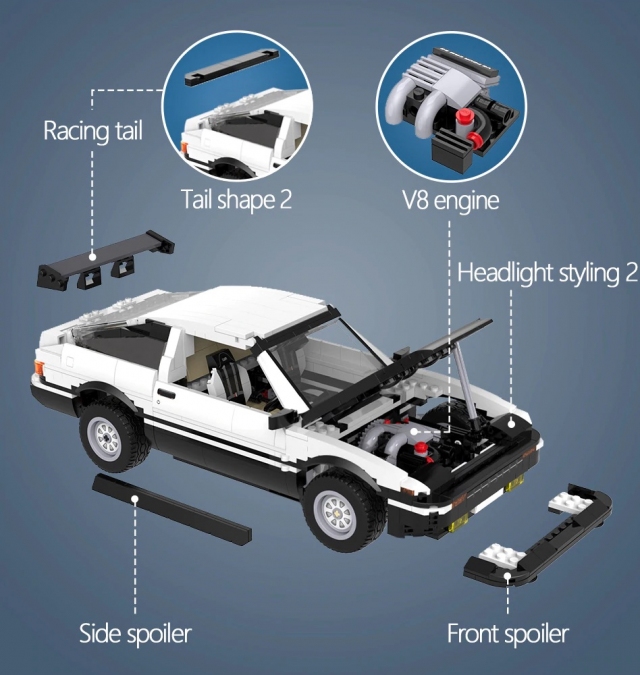 Kit ‘LEGO China’ ini didatangkan dengan alat ganti modifikasi seperti spoiler atau enjin V8 yang bukan sebahagian Initial D Hachiroku. Terakhir, anda boleh menghidupkan model ini dengan kotak bateri motor servo. Dengan 1,234 bongkah blok, mainan ini dijual pada harga serendah AS$41 (RM180).