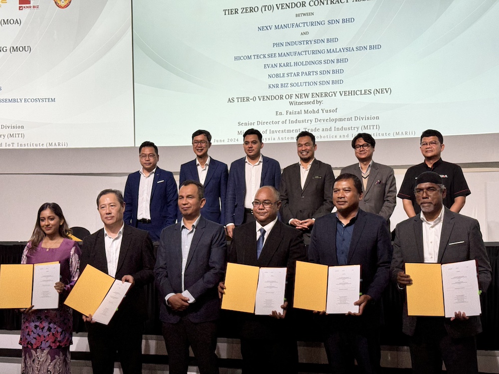 Presiden PEKEMA, Datuk Mohamed Nazari Noordin (berdiri bawah depan kiri) berkata, CADB sedang meneroka program CKD untuk pengeluaran pengeluar EV dari China, iaitu Dongfeng Motor (DFM).
