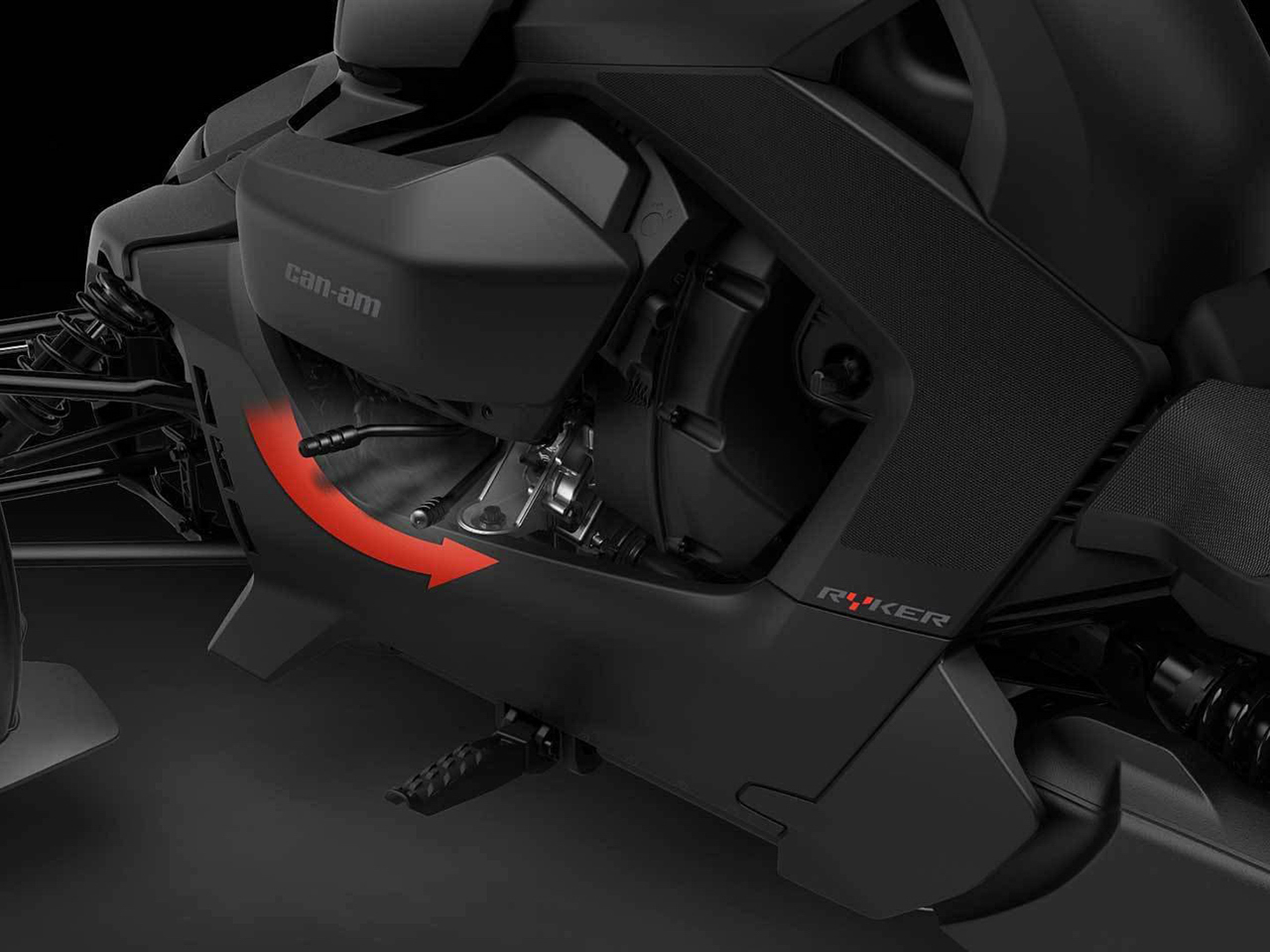 Aspek kecekapan dapat dilihat pada keseluruhan rekabentuk Ryker (2019). Panel fairing depan cuma satu unit plastik besar sebagai pelindung struktur enjin, dengan ruang muatan 7 liter diletakkan atas enjin. Menariknya, Ryker (2019) menggunakan pacuan akhir jenis syaf pacu (drive shaft) yang tersorok di sebalik swingarm dengan transmisi automatik CVT. Segalanya dilakukan bagi mengurangkan kos komponen.