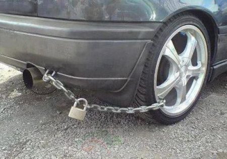 Ini cara yang normal dan biasa dilakukan mat motor dan penunggang basikal. Beli rantai dan lilitkan pada rim, casis, sproket, pelana atau swingarm. Jadi tidak salah pun kalau gunakan cara sama untuk kereta. Lilitkan rantai pada rim kereta.