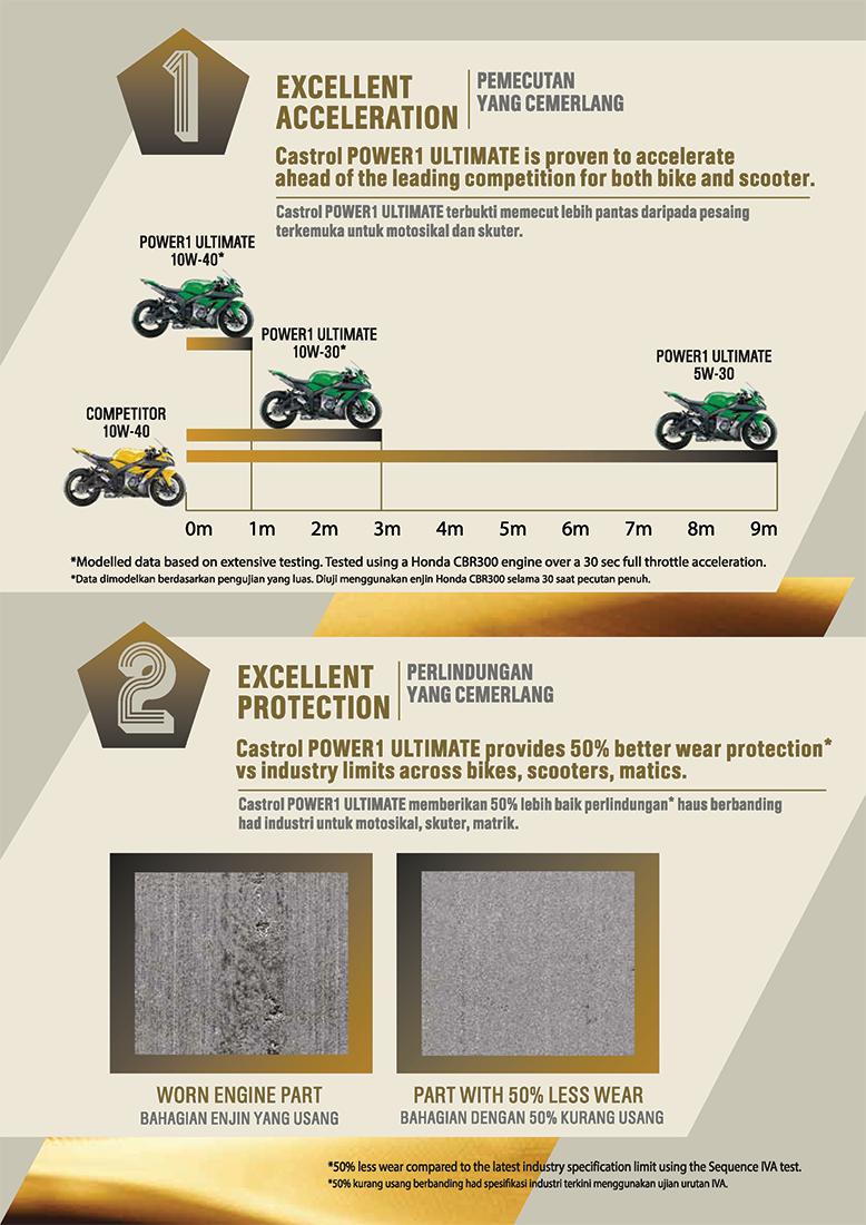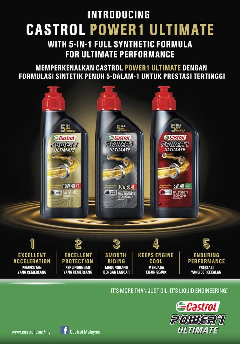 Terbaharu, Castrol memperkenalkan produk minyak pelincir motosikal sintetik penuh baharu Castrol POWER1 ULTIMATE dengan formulasi 5-dalam-1 yang unik. Nak satu? Anda boleh dapatkan pelincir ini secara atas talian di laman Shopee semudah KLIK SINI.