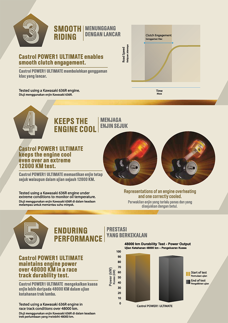 Minyak pelincir ini juga mampu mengekalkan 95 peratus prestasi asal dalam ujian ketahanan trek lumba sejauh 48,000km, sekali gus membuktikan keupayaan prestasi pelincir Castrol POWER1 ULTIMATE.