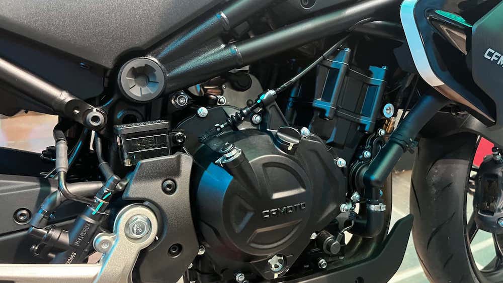 - Mewarisi sebahagian rekabentuk model CFMoto 800NK seperti lampu utama, set fairing agresif, skema warna lebih menonjol dan ekor mirip CFMoto 450SR.