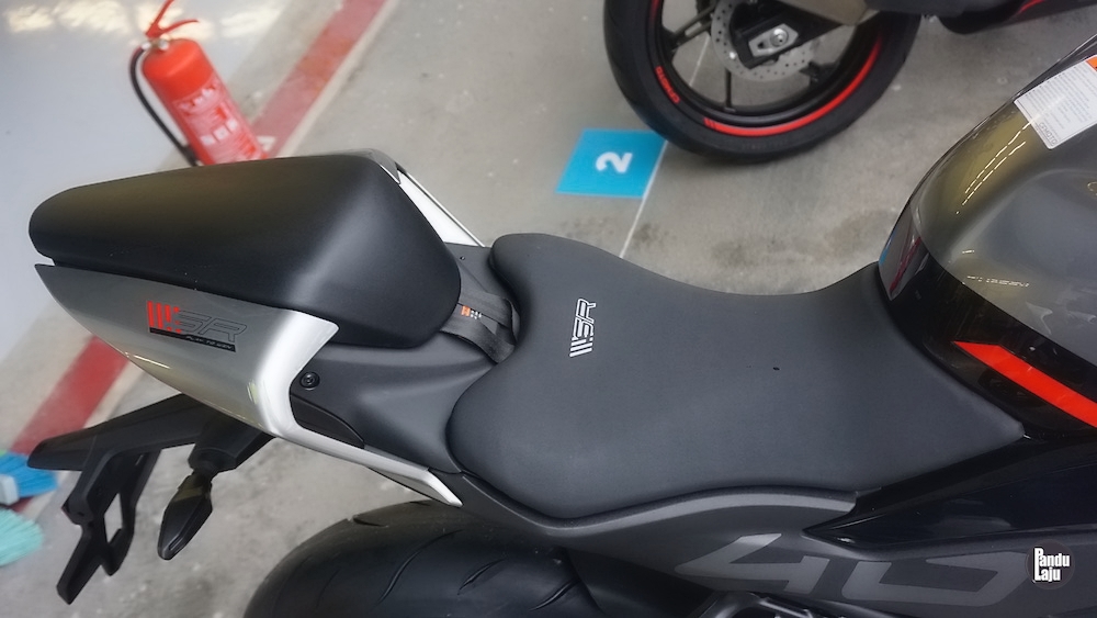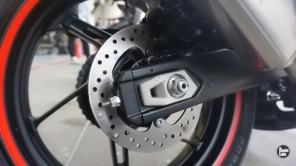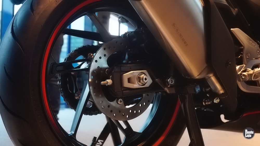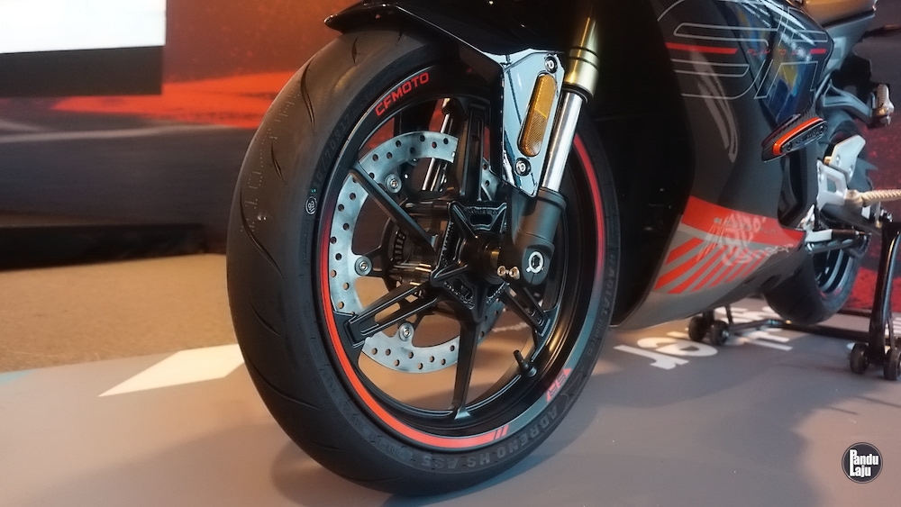 Rim aloi aluminium 17 inci dengan tayar saiz 110/70 (depan), dan 150/60 (belakang), manakala tayar jenis semi-slik CST Adreno.