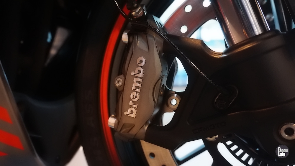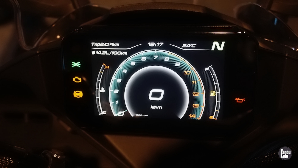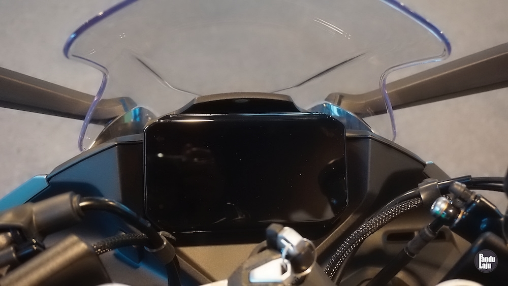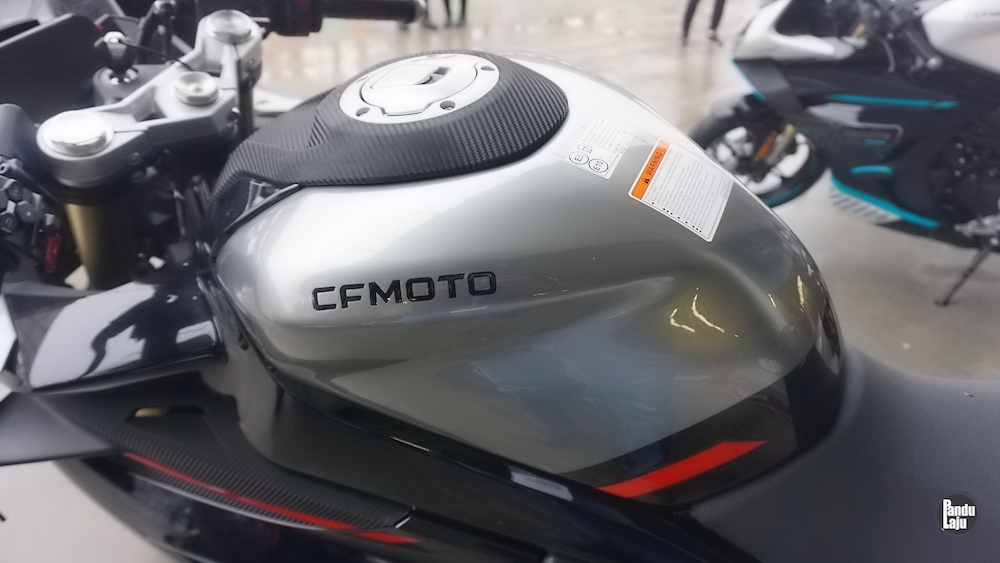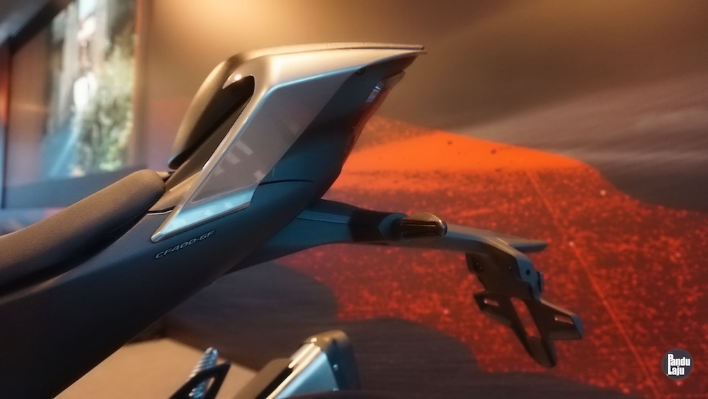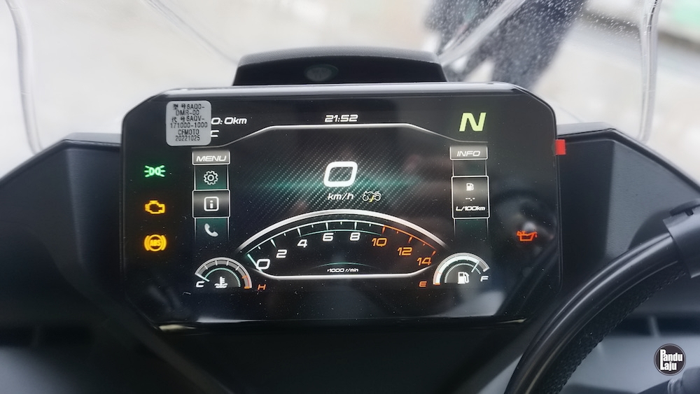 Panel meter jenis digital TFT 5 inci berserta konektiviti Bluetooth menerusi aplikasi CFMoto Ride App untuk akses sistem navigasi, masa lap dan sejarah tunggangan.