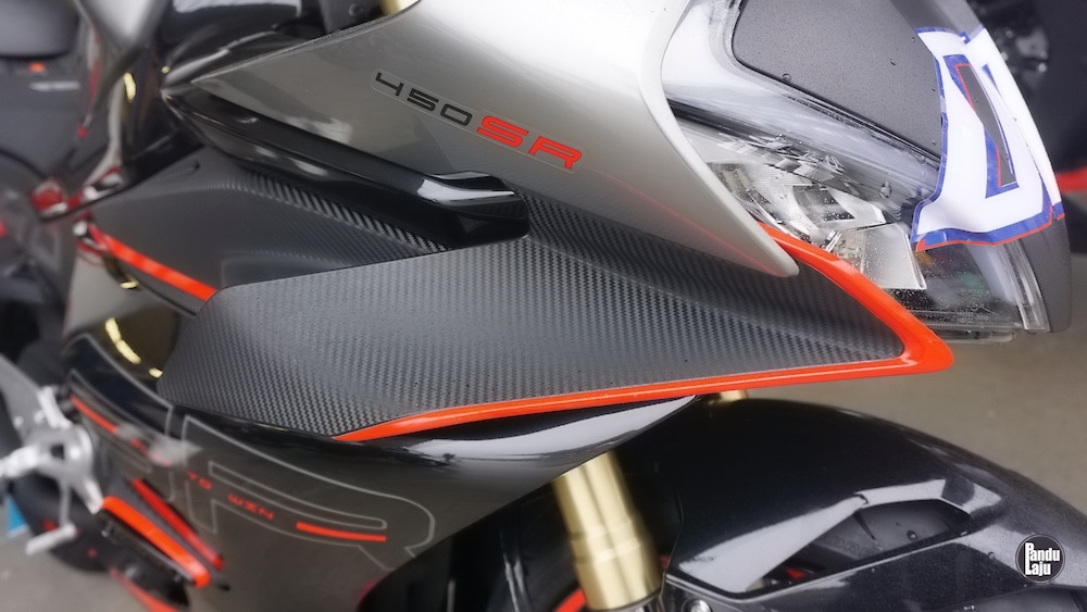 CFMoto 450SR (2023) dilengkapi sepasang winglet untuk membantu meningkatkan daya mendap (downforce). Sistem lampu LED penuh untuk lampu depan, lampu siang (DRL), lampu signal belok dan lampu belakang.