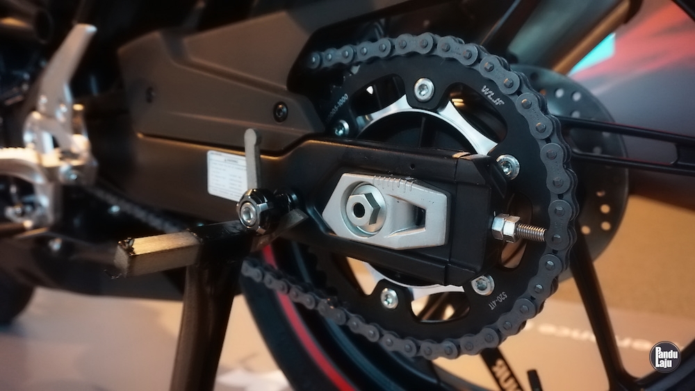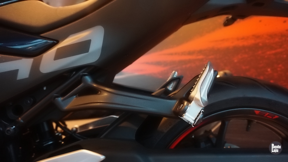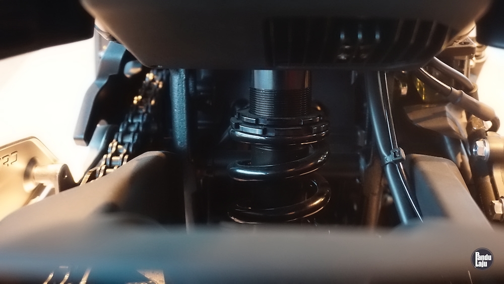 Sistem suspensi fork terbalik (USD) di depan, dan monoshock boleh laras di belakang dengan swingarm kembar.
