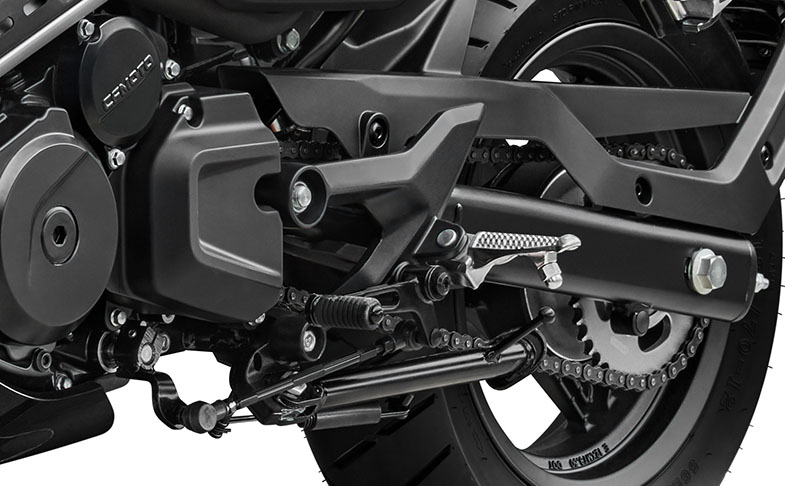 Sistem suspensi menggunakan fork terbalik (USD) di depan dan monoshock di belakang. Sistem brek jenis cakera tunggal di depan dan belakang. Bahagian roda dipasangkan rim aloi 12 inci dengan tayar 120/70 di depan, dan 130/70 di belakang.