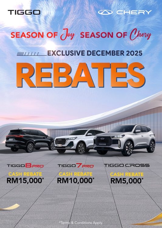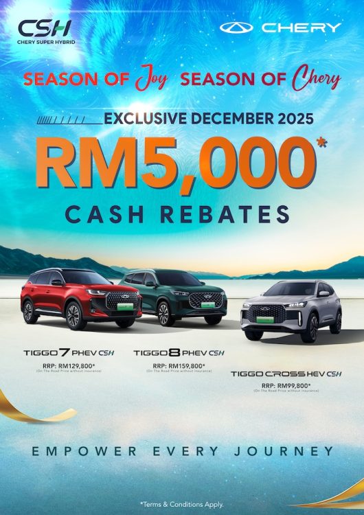 CHERY Malaysia memeriahkan sambutan penghujung tahun dengan kempen promosi terbesar setakat ini, menawarkan rebat sehingga RM15,000 bagi model terpilih selain waranti bateri lanjutan percuma untuk semua model PHEV.