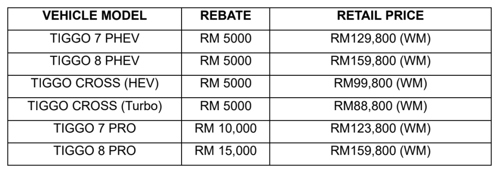 Chery turut menawarkan rebat RM5,000 untuk dua model elektrifikasi terbaharu: