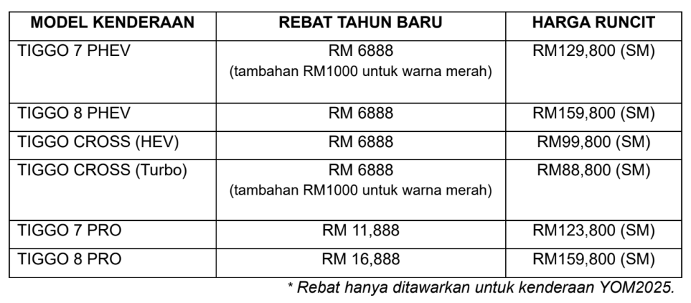 Chery Malaysia Tawar Rebat Sehingga RM16,888 Sempena Tahun Baharu 2026!