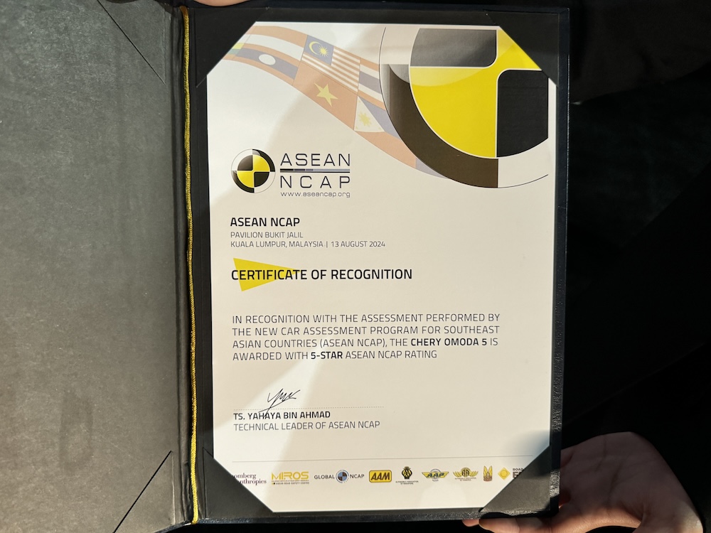 Sijil penarafan lima bintang Asean NCAP itu disampaikan Ketua Pengarah MIROS, Prof Madya Dr Siti Zaharah Ishak kepada Naib Presiden Eksekutif Chery Corporate Malaysia, Leo Chen petang tadi.