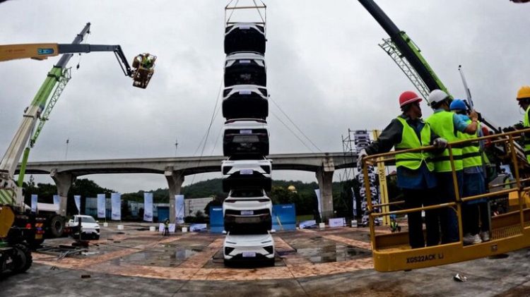 PENGELUAR automobil dari China, Chery tampil unik mempromosikan kenderaan utiliti sukan (SUV) elektrik baharu eQ7, iaitu membina menara kereta secara menindan atas dan bawah untuk menunjukkan betapa kukuh badan SUV berkenaan.
