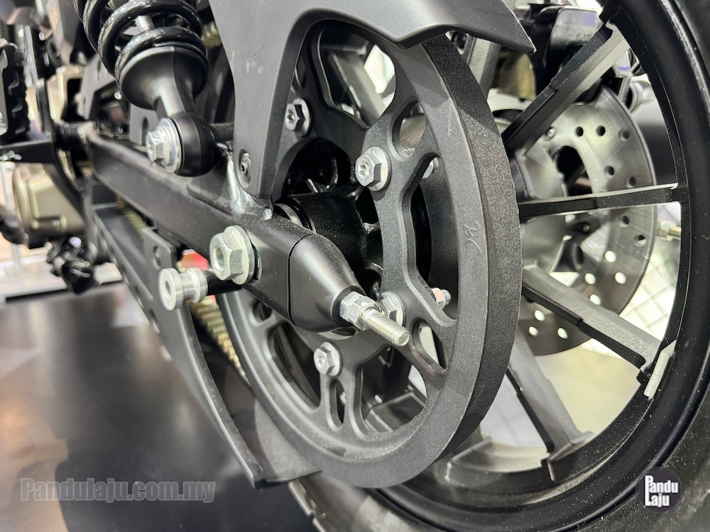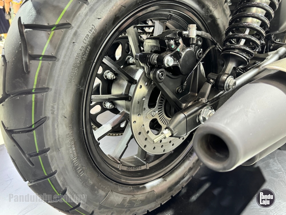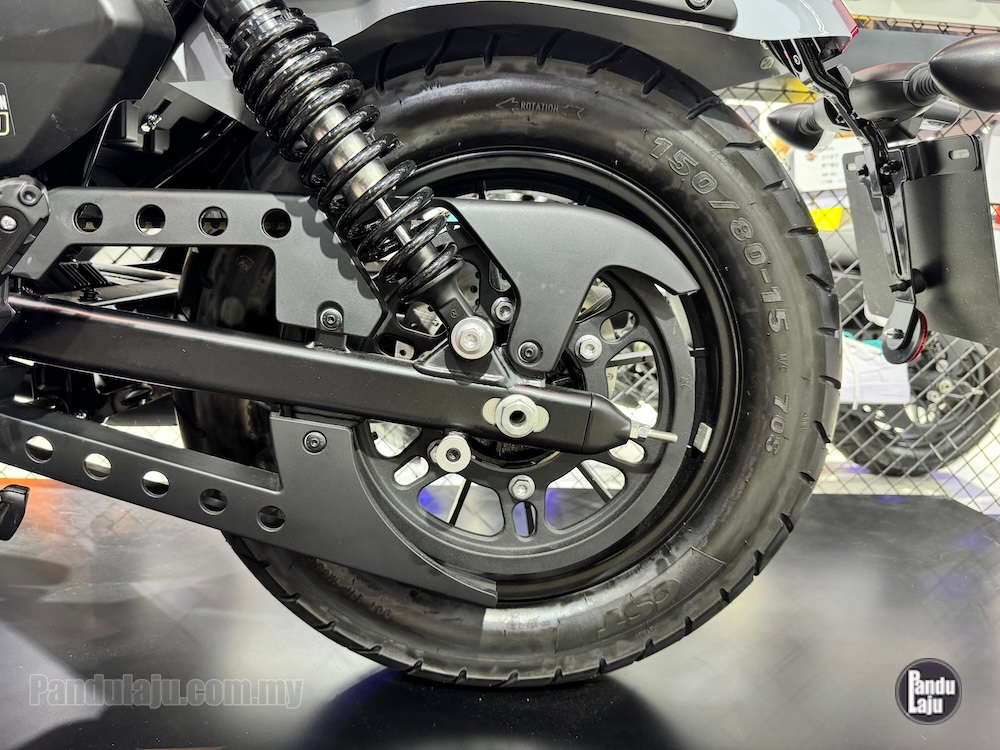 - Rim aloi 16 inci depan dengan tayar 120/80 (depan) dan rim 15 inci dengan tayar 150/80 (belakang).
