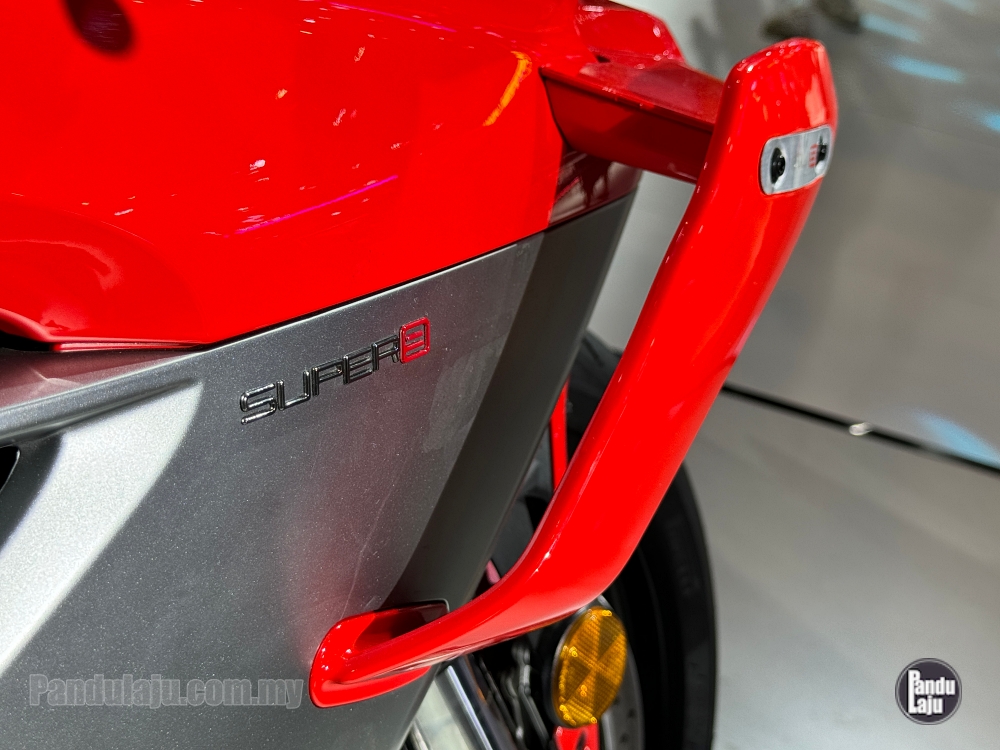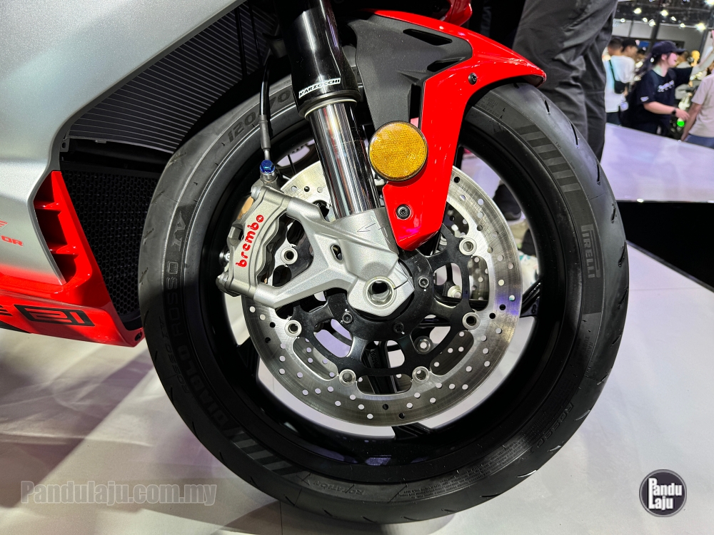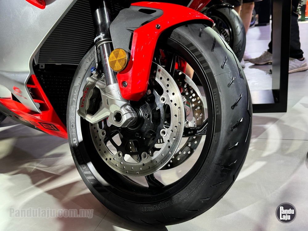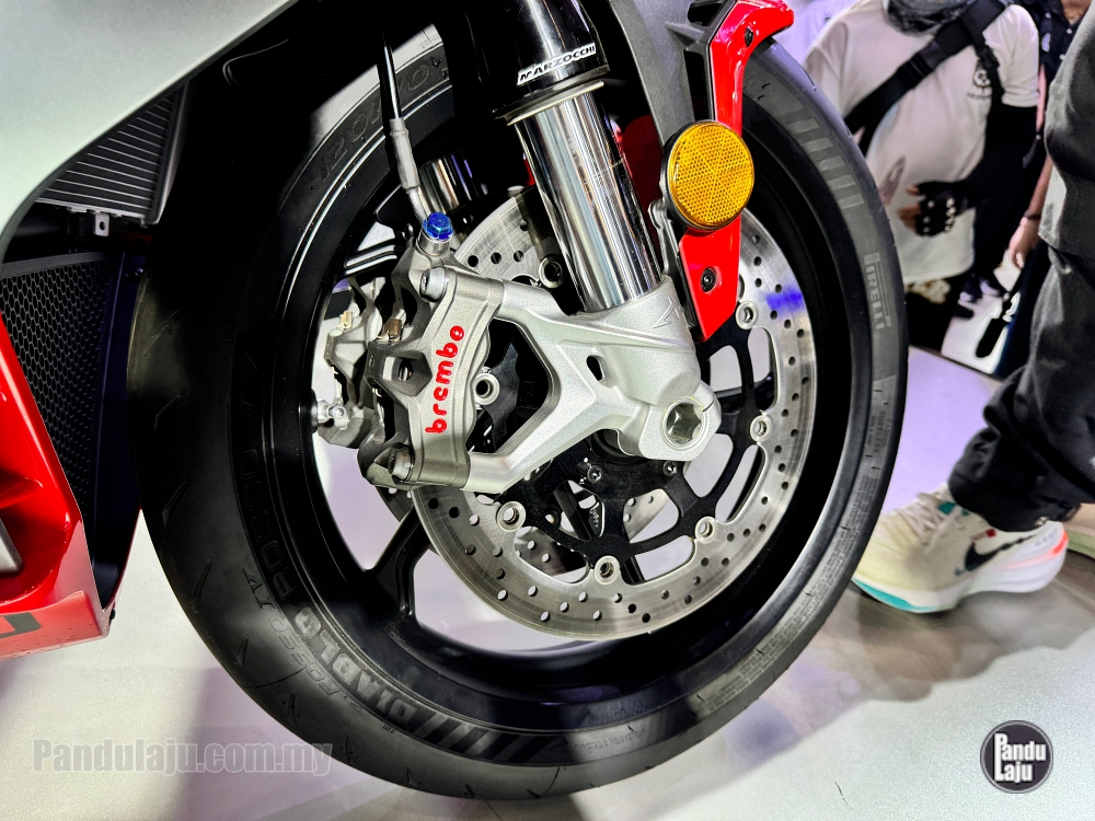 - Brek cakera kembar 320mm dengan kaliper Brembo Stylema 4-piston (depan), dan cakera tunggal 260mm kaliper Brembo dwi-piston (belakang).