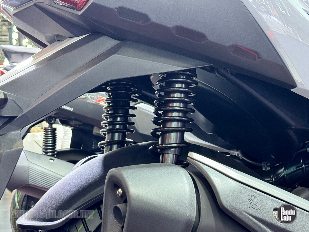 - Sistem suspensi fork konvensional (depan), dan dwi-absober boleh laras 5-tetapan (belakang).