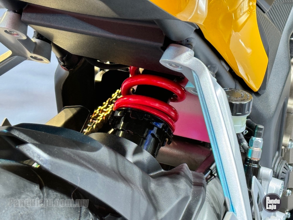 - Sistem suspensi fork terbalik (USD) di depan dan monoshock di belakang.