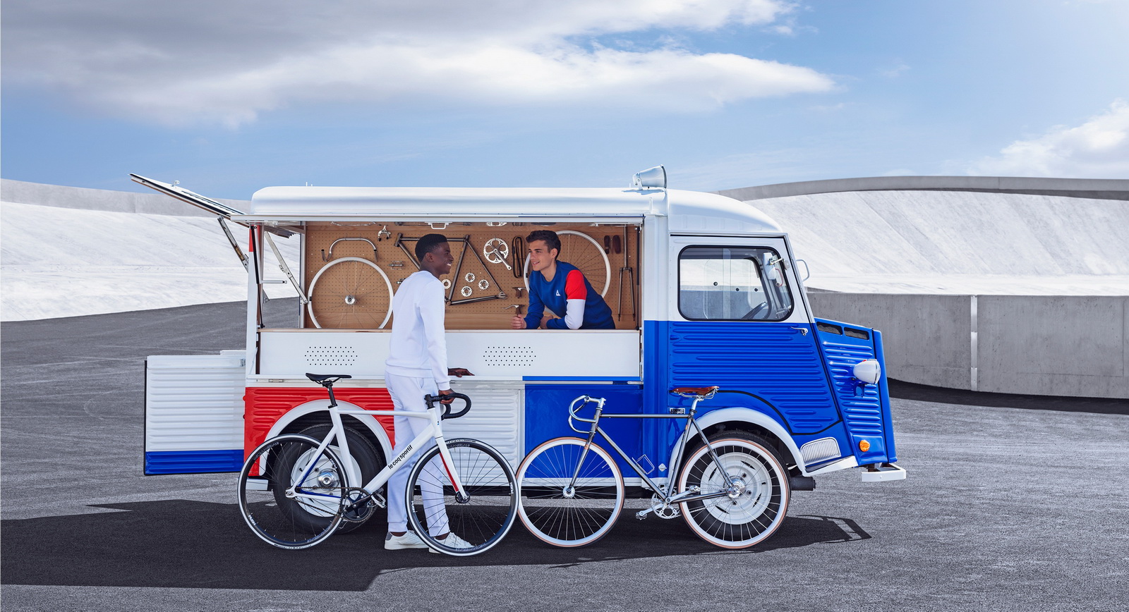 Malah, van panel itu juga boleh ditukar kepada bengkel pakaian semasa acara berbasikal dan turut disediakan rakan peneman yang lebih moden bergaya, New Dispatch – juga berwarna sama – putih, biru dan merah.