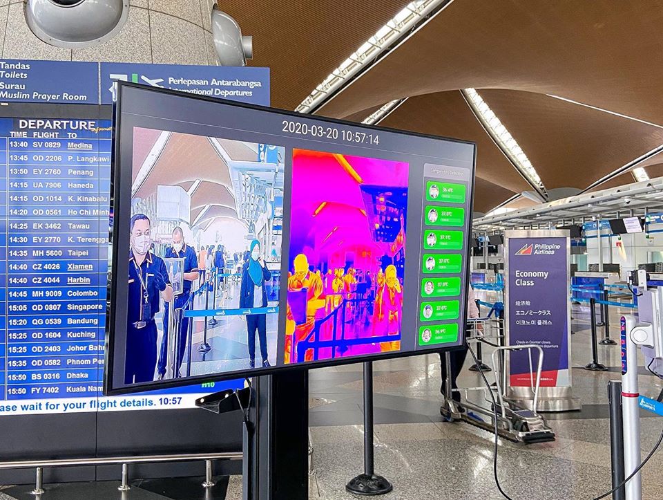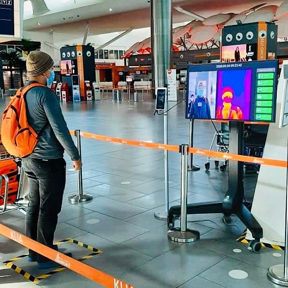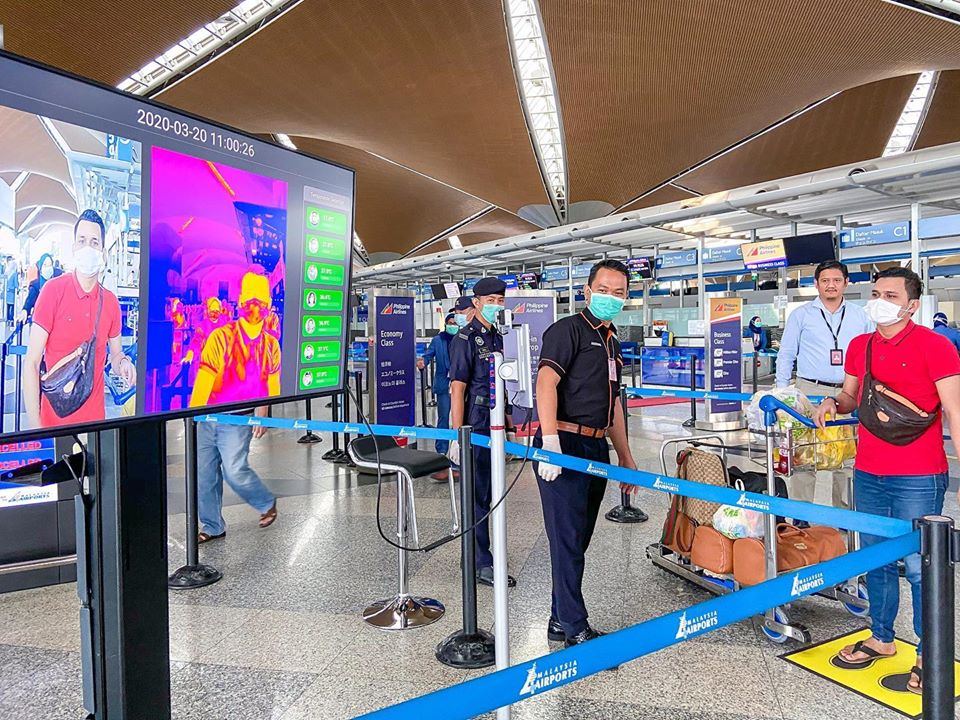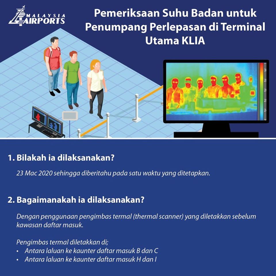 PENUMPANG yang berlepas dari terminal utama Lapangan Terbang Antarabangsa Kuala Lumpur (KLIA) perlu menjalani pemeriksaan suhu badan menerusi penggunaan peranti pengimbas termal (thermal scanner) yang diletakkan sebelum kawasan daftar masuk.