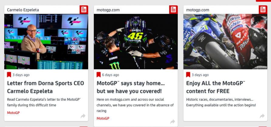 Bagi menghilangkan kebosanan dan mengekalkan keterujaan, MotoGP memutuskan memberikan akses tontonan video percuma dalam laman web rasmi sukan permotoran itu sepanjang tempoh krisis. Sebelum ini, pengguna perlu melanggan kira-kira €35.99 (RM171) jika mahu menonton video lengkap tayangan langsung MotoGP dari laman web berkenaan.