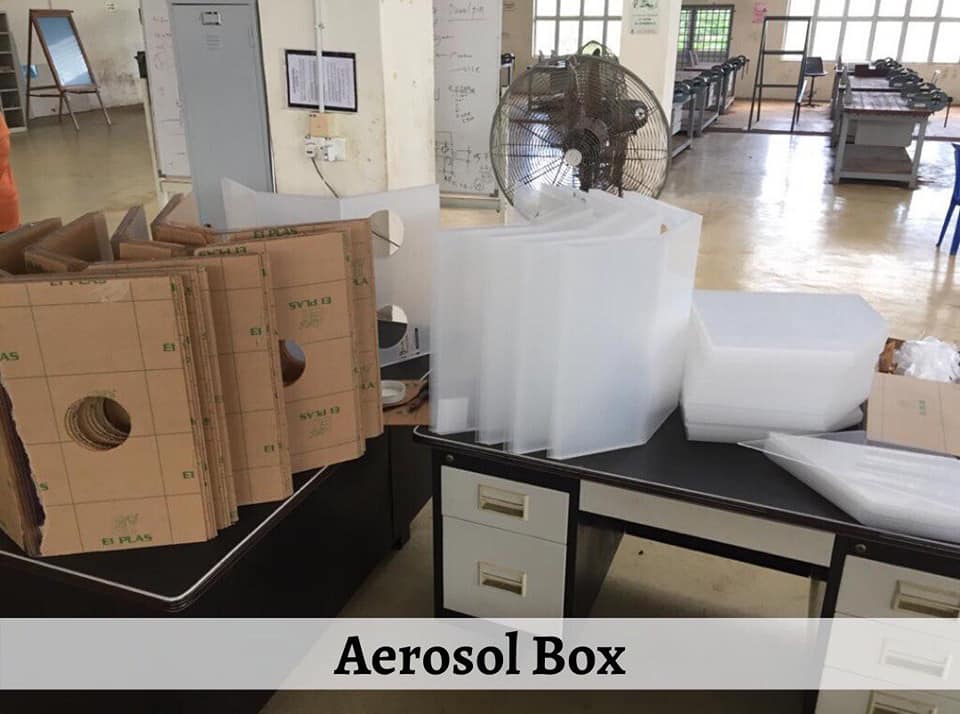 Selain mesin nyah kuman, fakulti tersebut turut menghasilkan bingkai perisai muka (face shield frame) dan kotak aerosol (aerosol box) sebagai alat pelindung kepada petugas barisan hadapan yang bekerja menangani wabak Covid-19.
