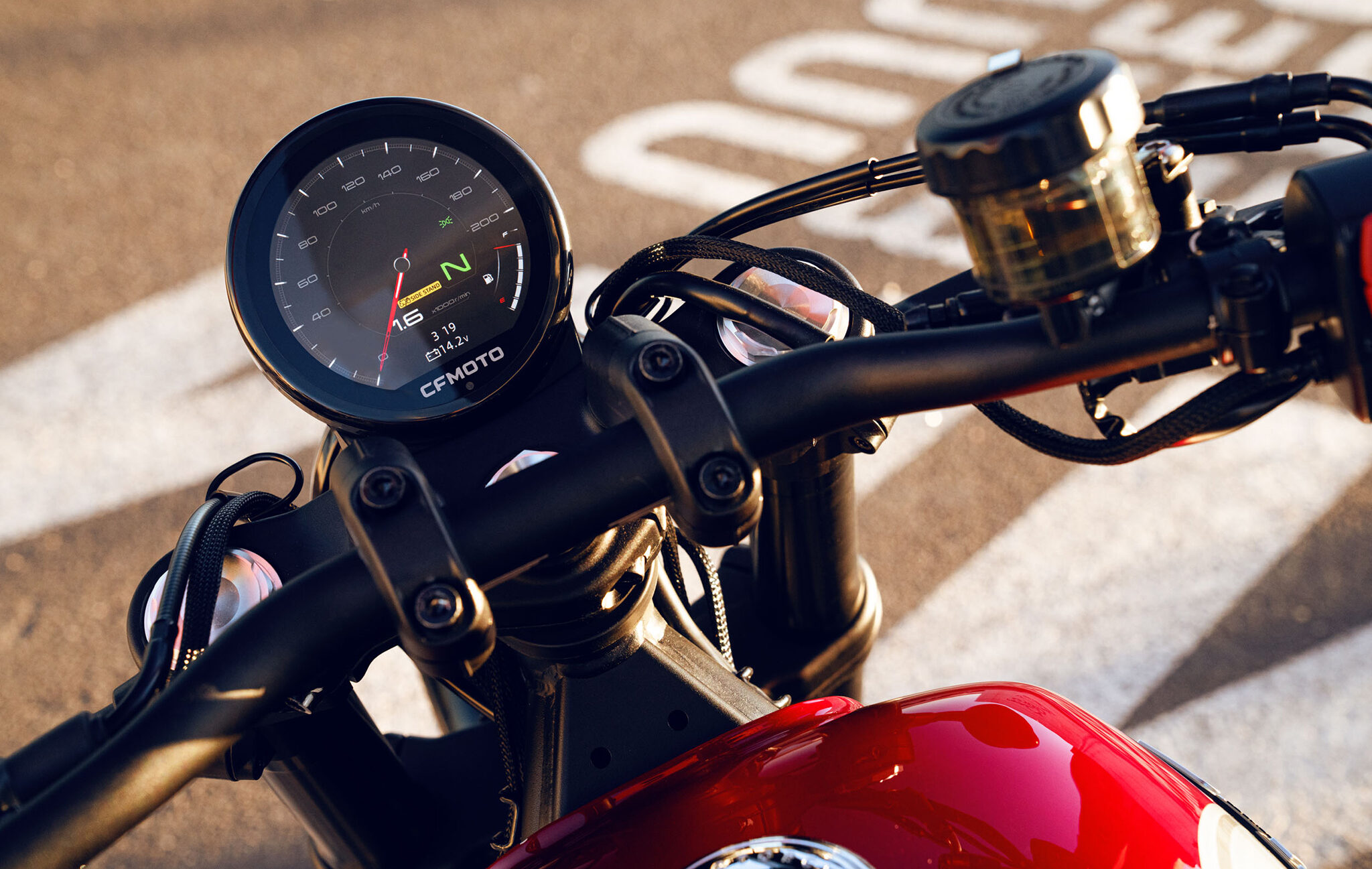 Berat kerb 181kg, tinggi pelana 690mm. Panel meter TFT bulat 3.6 inci dengan konektiviti Bluetooth untuk akses aplikasi CFMoto Ride untuk maklumat tunggangan.