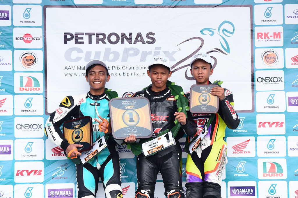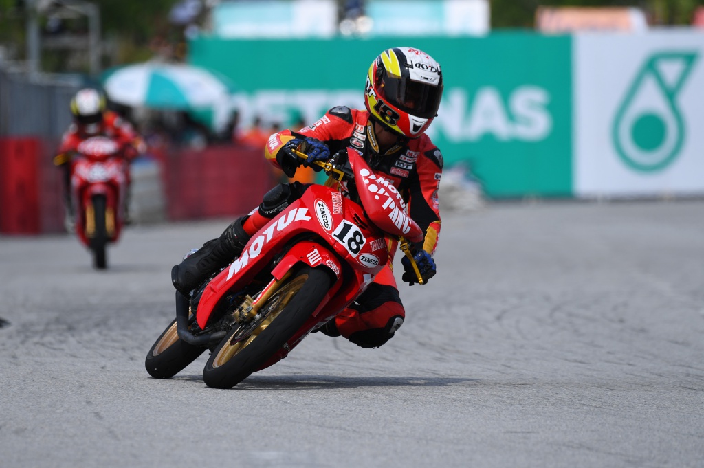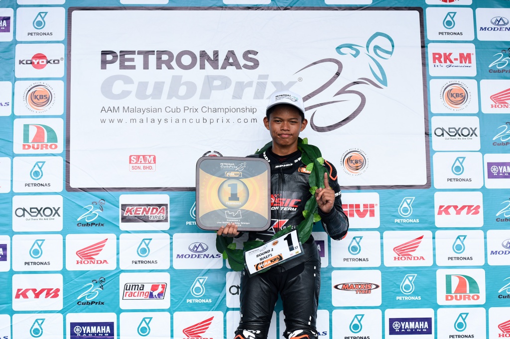 AHMAD Afif Amran mempamerkan aksi bertenaga dan dramatik sebelum menjuarai perlumbaan CP150 dalam saingan Pusingan 2 Kejuaraan Cub Prix AAM Malaysia Petronas 2018 yang berakhir di Litar MAEPS, Serdang, Selangor.