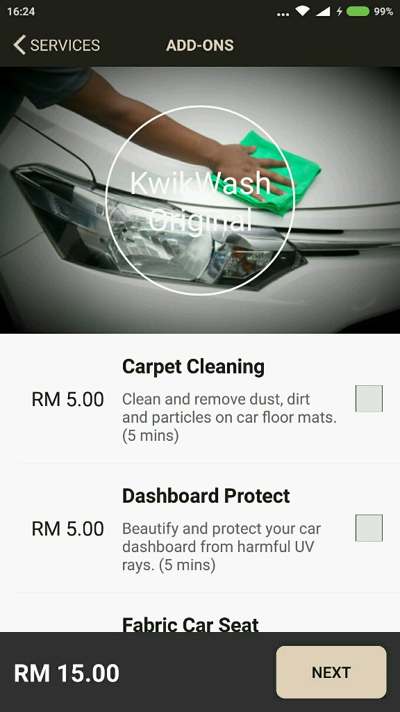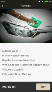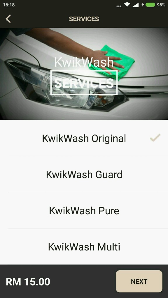 Anda akan dipaparkan dengan senarai cucian yang akan dilakukan, termasuk anggaran masa. Bagi cucian KwikWash Original, antara proses cucian dilakukan ialah cucian luaran, vakum dalaman, kilat tayar dan cucian berserta rawatan tingkap. Anggaran masa ialah 15 minit. Tekan NEXT