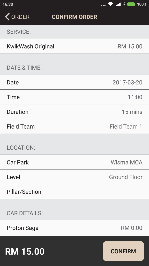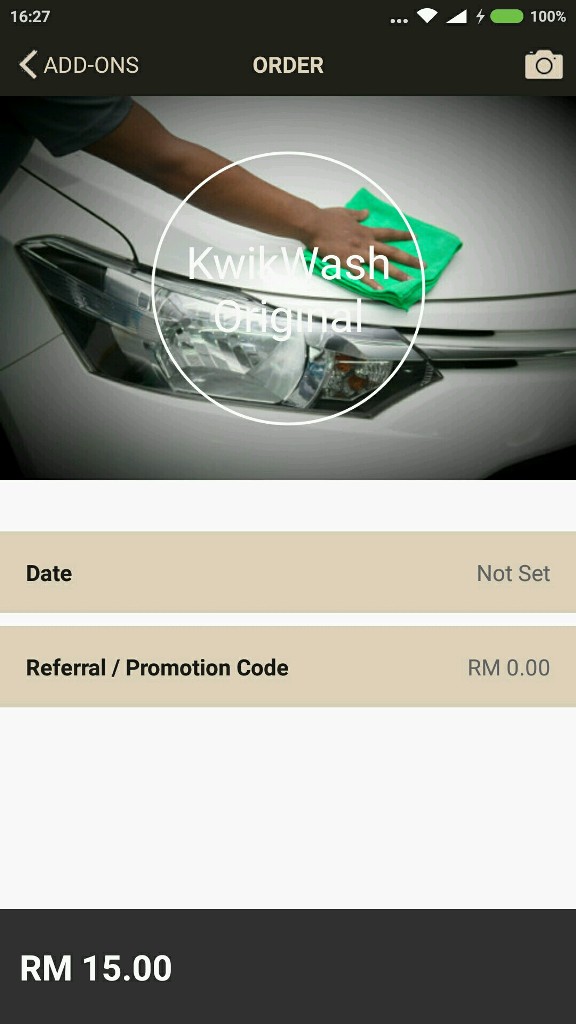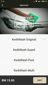 Harga akan dinyatakan sebaik saja anda memilih salah satu daripada cara cucian yang dimahukan. Kami memilih KwikWash Original yang berharga RM15.
