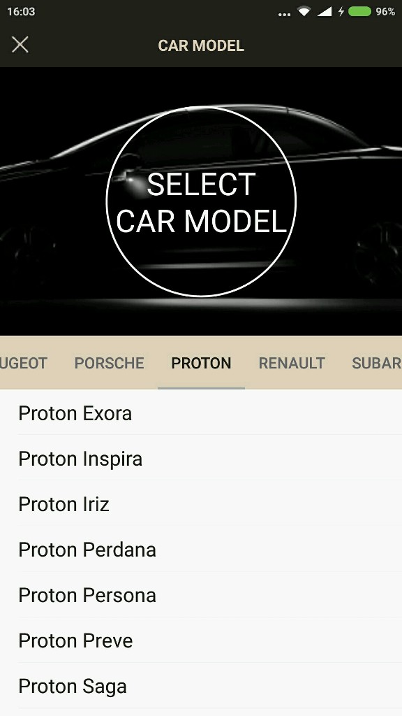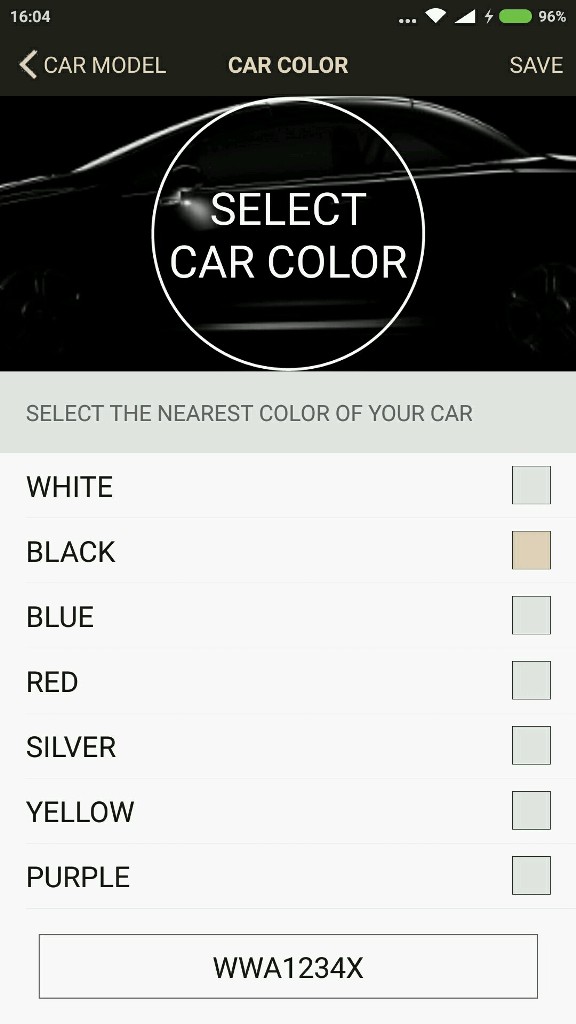 Anda perlu pilih model kereta, warna dan nombor plat.